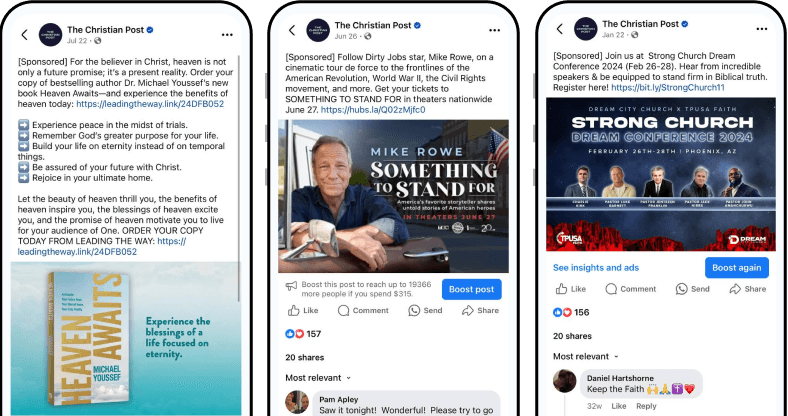 The Christian Post helps you reach our unique, faith-based Facebook followers—an audience you can't access on your own. Using Facebook's ad platform, we target brand-matching audiences to maximize your reach and engagement. Our team provides performance reviews and optimizes your campaign to ensure it meets your goals. Ready to grow your business on Facebook?